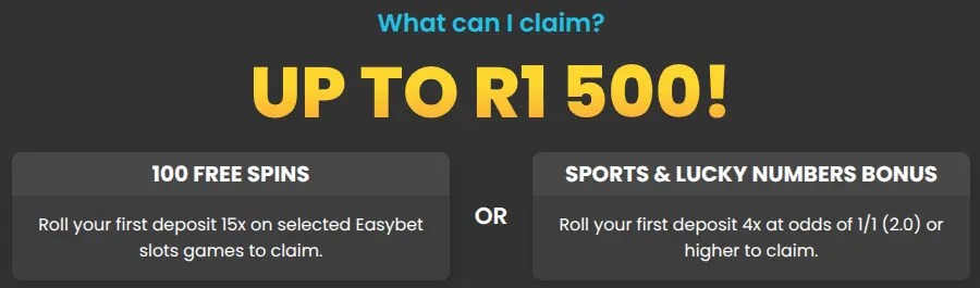 When the time comes for your first real money deposit, you will have to choose your reward: a 150% match worth up to R1,500 for sports betting or lucky numbers or 100 free spins worth R0.75 each that you can play on slot machines.